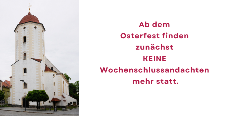 Lange hat uns das Angebot der Wochenschlussandacht in Finsterwalde begleitet. In der letzten Zeit ist es aber nur von wenigen Menschen in Anspruch genommen worden. Auch sind die dafür bisher bereitstehenden Mitarbeitenden weniger geworden und mit anderen Aufgaben befasst. Deshalb wollen wir ab dem Osterfest zunächst keine Wochenschlussandachten mehr anbieten. Der Sonntagsgottesdienst bleibt aber verlässlich!