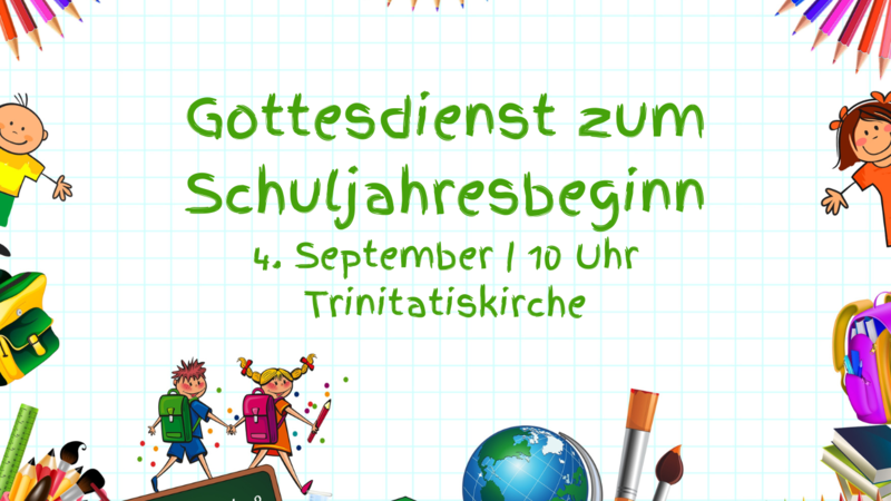 Herzliche Einladung zum Gottesdienst zum Schulbeginn am Sonntag, dem 4. September, um 10 Uhr in unserer Trinitatiskirche. In diesem Gottesdienst wollen wir besonders die neuen Christenlehrekinder und Konfirmanden begrüßen.